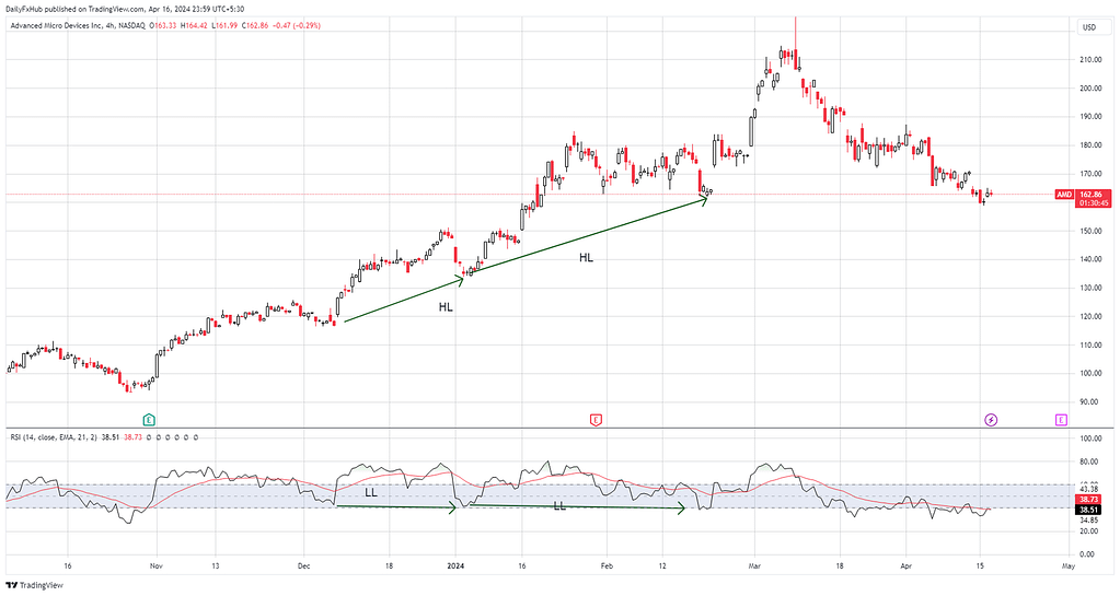 Conversely, in a downward-trending market, bearish hidden divergence manifests when the price forms a lower high, signaling persistent selling pressure, while the RSI indicator records a higher high. This discordance suggests that despite fleeting bullish attempts, the overall trend remains firmly bearish. It implies that sellers are still dominant, ready to exert further downward pressure on the price.